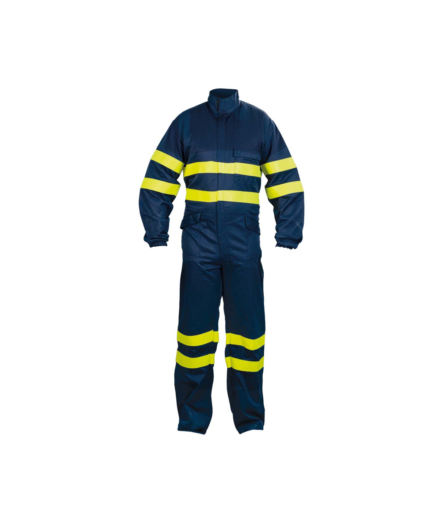 FR coverall. Covered nylon zip closing with velcro. Raised neck with velcro closing. Three front pockets and one back pocket with flap and velcro closing. Elastic cuffs. Two yellow retroreflective bands on the chest, back, sleeves and legs.